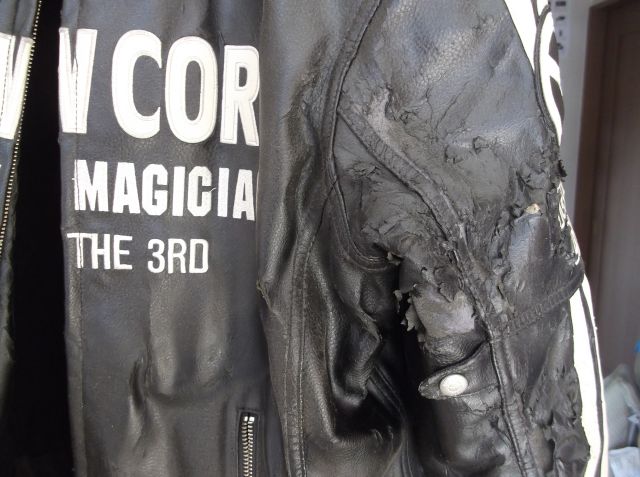 下記写真は以前着ていたフェイクレザージャケット、劣化は一気に進みボロボロに、廃棄しました