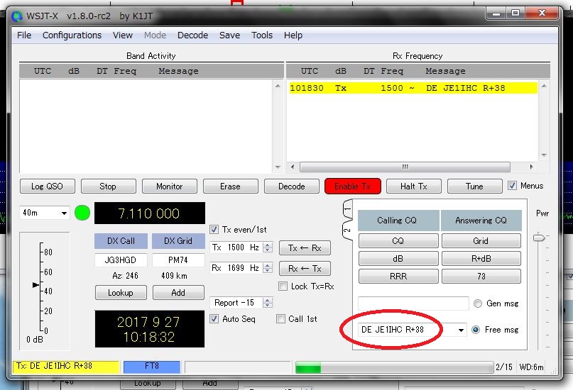 DEを選択の場合はXTMsg"DE JE1IHC R+38”が、コールサインを入力した場合はTxMsg"JA8AYD