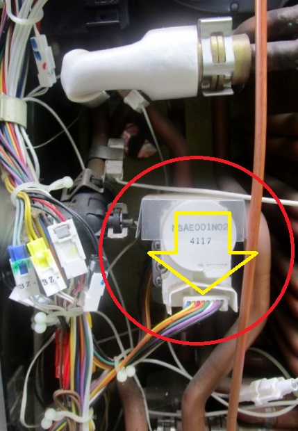 風呂釜電源を落として給湯用混合弁(下左の写真)のコネクターの状態を確認、接触不良や断線がないか抜き差しして調べます